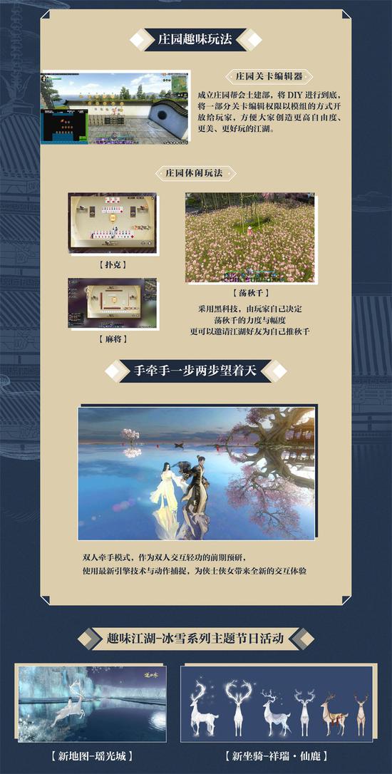 而这片全新的江湖,也在暗暗的发生着巨变:江湖身份系统将增加成员,除了出家选项之外,道士、儒生等更多身份等君选择;奇遇池扩容,旷世奇遇线索投放,俯仰之间,江湖皆有惊喜;除此之外,庄园建造自由度再升级,冰雪系列主题节日活动亟待投放。这些非数值追求玩法的加大投入,显示了逆水寒在游戏内容上继续加注、扩大研发的决心。