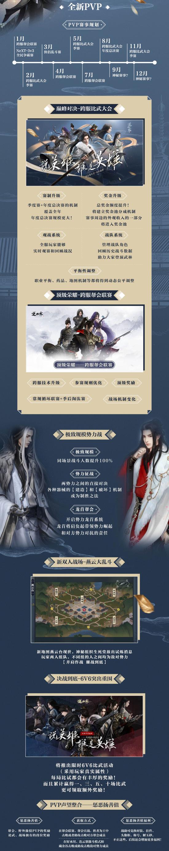 开题重点就是PVP系统的体系化丰富升级。2人组队的燕云大乱斗、6人跨服比武大会、数十人的帮派跨服联赛、万人的势力征战……不管玩家喜欢多大规模的对战,都能在战场上找到自己的节奏。而跨服对战机制、奖金额度提升、PVP声望的整合,更激发了玩家PK的动力。