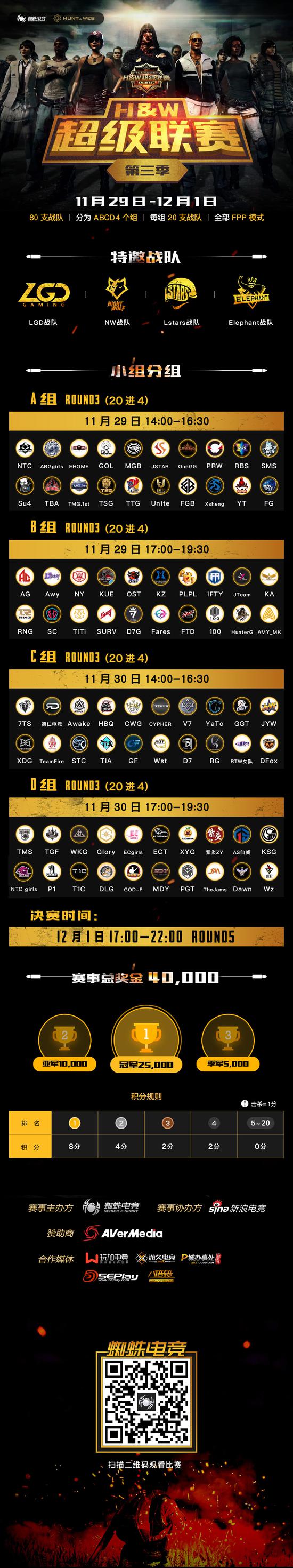 11月29日即将开赛的蜘蛛电竞H&W超级联赛第三季,是由“给你好看的电竞赛事平台蜘蛛电竞“独家冠名主办,新浪电竞共同协办,圆刚AVerMedia赞助的2018官方授权PUBG比赛。包括RNG、LGD在内的84支绝地求生超级战队已经集结完毕,他们将在11月29日-12月1日三天的激烈比赛中捉对厮杀,硝烟在即!据悉,主办方蜘蛛电竞还将首次推出参赛队伍第一视角+队内语音的观赛模式,这么爽快的观赛体验不要错过。