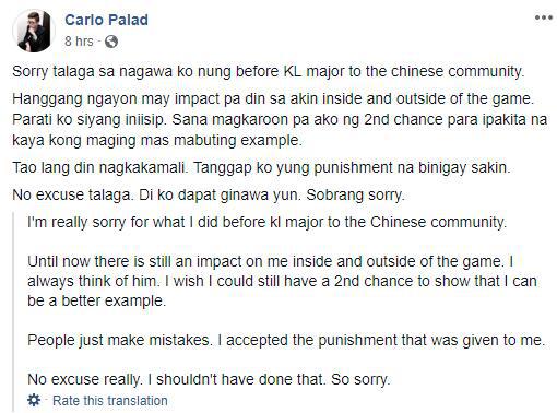 我真的对自己在吉隆坡Major前对中国社区所做的事感到抱歉。直到现在这件事还在游戏中、游戏外影响着我。我总是会想起来。我希望自己能够有第二次机会,证明我能成为一个正面的榜样。