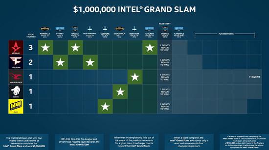 EPL S8最大悬念无疑是Astralis能否取得Intel赛事大满贯成就。所谓赛事大满贯,是ESL赞助商Intel设置的奖项,如果某支战队能在他们参加的ESL One、EPL、IEM和DreamHack大师赛四个系列赛事的最近十场比赛中获得四个冠军,就将获得Intel大满贯头衔,并得到额外100万美元奖励。目前Astralis已获得三个冠军(DreamHack马赛大师赛、EPL S7、IEM芝加哥),只要再获得EPL S8冠军,Astralis就将成为首个获得Intel大满贯成就的战队。