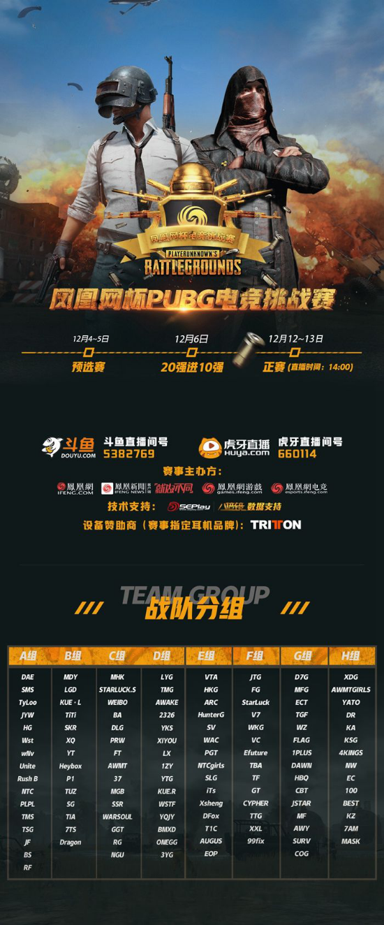 由凤凰网、凤凰网电竞主办,PUBG(公司)授权的第二届凤凰网杯PUBG电竞挑战赛(ifengCUP PUBG challenger,简称FCPC)报名已结束,最终120多支国内一二线战队报名,其中包括老牌FPS战队LGD、TYLOO、wNv、Efuture、FG、汉宫HG等,也有新贵DLG、JTG、DAE、YTG、weibo、WZ等战队参赛,相信强大的报名阵容一定会给观众带来一场一场紧张激烈的对抗!预选赛将于12月4至12月6日进行,正赛时间为12月12日、13日,正赛期间为大家带来精彩的直播!