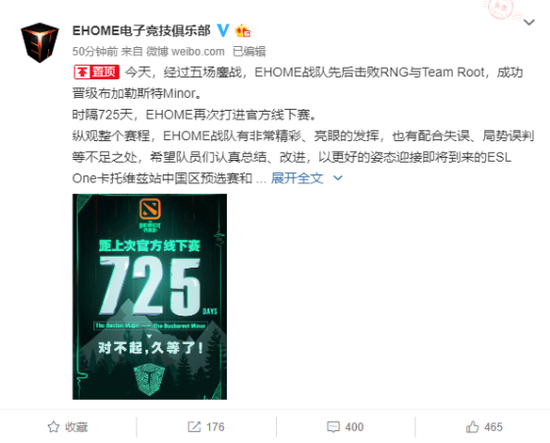 赛后EHOME官方微博发声:“时隔725天,EHOME再次打进官方线下赛。”
