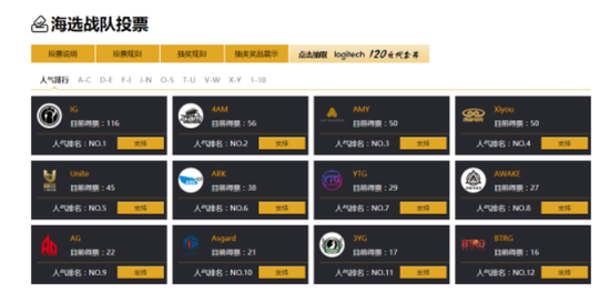 之前我们为玩家介绍了详细的投票规则,在12月8日海选赛开赛前我们将关闭海选战队人气投票通道,本次投票的战队所得票数将保留至下一次投票通道开启。我们将最终投票排名前12位的战队显示给大家。