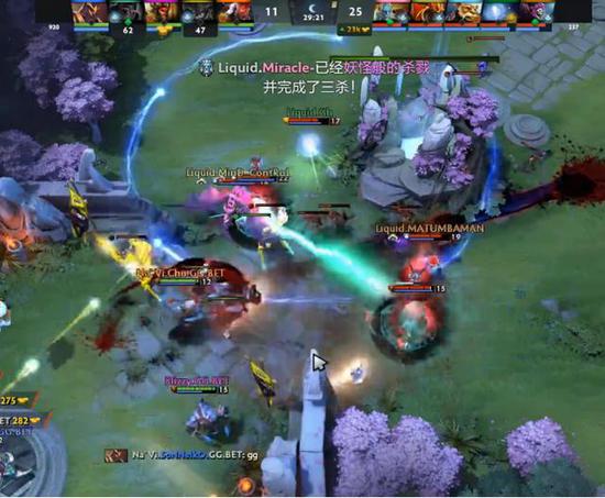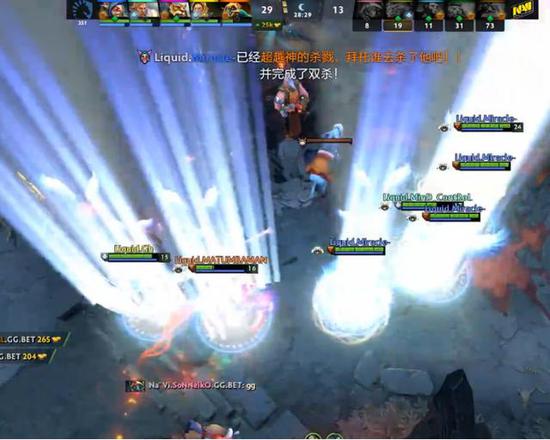 21分半光法和米波在上路杀死了大圣,米波转战下路再杀斧王,还没完,Liquid又在米波的带领下冲上Na'Vi上路高地干掉了海民神谕和火枪,海民买活再死一次,火枪交出买活勉强守住了上路高地,但此时Liquid已经取得了接近20000的经济优势,比赛已然进入垃圾时间。