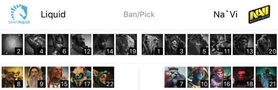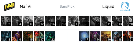 Na'Vi在天辉方,Liquid在夜魇方。分路方面,MagicaL的黑鸟在中路对阵马桶哥的暗牧。下路是水晶哥的幻影刺客和索尼克的沉默对阵Kuroky的酒仙和MC的龙骑。上路是Blizzy的兽王和Chu的天涯墨客对阵Miracle的猴子和Gh的精灵。