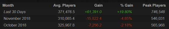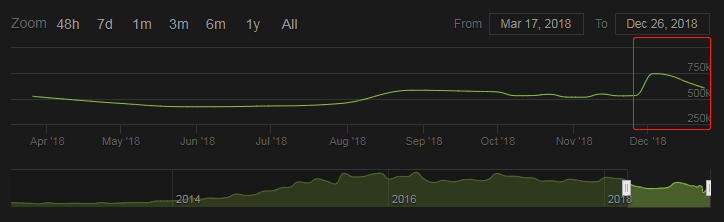 在 CSGO 进入免费时代的第一周,玩家人数激增,由 steamcharts 上的数据就能看出,这个被玩家调侃为“dead game”的游戏在一个月的时间内增加了6万玩家,在线峰值达到了74.6万人次,是继2015年以来的最高峰值。