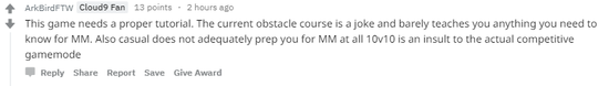 “这个游戏需要一个合适的新手教程,目前的教程就是一个笑话,根本就教不了任何人竞技模式所要知道的东西。对于那些准备开始打竞技匹配的玩家而言,休闲模式对于真正的竞技训练起不到任何作用,10v10 简直就是对竞技的一种侮辱。”