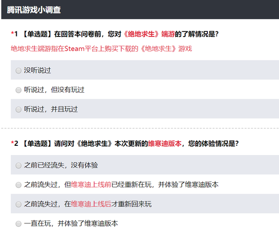 腾讯最近在网上发布了一个约10分钟的《绝地求生》的调查问卷。这份问卷是为PC端玩家量身打造的一份问卷,从玩家何时接触到绝地求生,到玩家对游戏内容的满意度,再到玩家对游戏内细节的看法,都统统包含在了这份问卷调查里面。