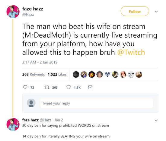 大家纷纷质疑,到底是为何,怎么Twitch又让这位殴打女性的暴力狂复出了,“某些发表攻击性与歧视性语言的主播都被封杀了,怎么这位直播殴打怀孕女的主播还能复出,可叹。”