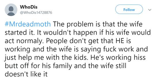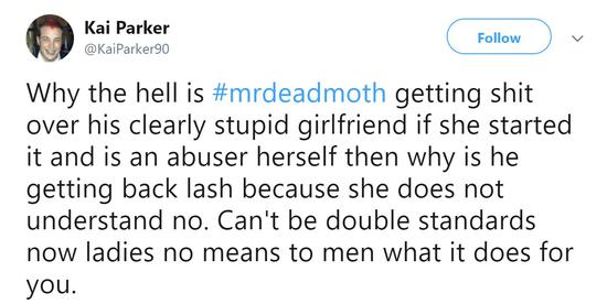 Luke Munday,26岁,主播昵称“MrDeadMoth”,2018年12月中旬在Twitch直播中被曝对其21岁的怀孕女友大打出手,打伤脸部,虽然视频中可以听到女友以及他们两个分别为3岁、20个月大的女儿的哭喊声,但这个殴打的经过并未被全部拍下,而是受伤的女友所称,她在视频表示被男友打伤了脸。