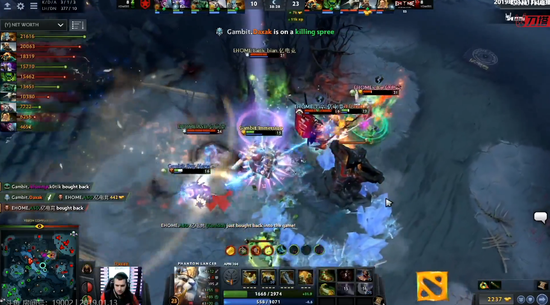 随着PA暗灭BKB成型,EHOME进入了强势期,抓谁谁死。25分钟二代肉山刷新,EHOME拿下盾奶冲上Gambit高地,送盾之后PA直接开启BKB爆爆爆!连破三路,拿下比赛!恭喜EHOME!