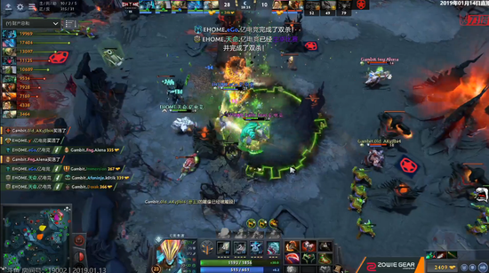 16分钟,Gambit开雾打盾但被EHOME发现,虽然Gambit还是拿到了肉山盾,但是EHOME依靠出色的配合让拿盾的潮汐送出了两条命,EHOME团灭对手!