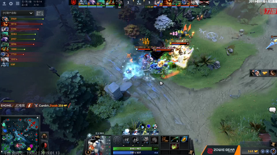 对线阶段小精灵强保斯温,猛犸则是在光法的帮助下无解肥,中路军团对阵电魂居然经济也能打成五五开,显然EHOME开局不错。但由于军团先出的臂章而非跳刀,在13分钟的一波团战中EHOME被Gambit打成四人团灭。