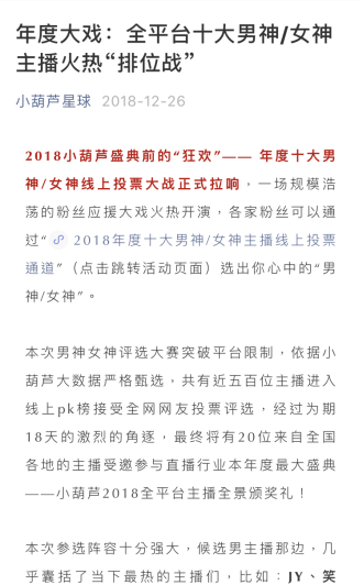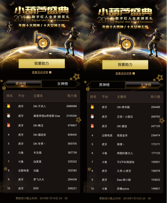 作为小葫芦盛典前的“狂欢”——年度十大男神/女神票选活动率先启动。新势力、老江湖齐聚,JY、白鲨、奇怪君、仙某某、轩轩、孤影、骚白、冯提莫、MISS、周淑怡、金禾、烤羊腿等四百位人气主播的粉丝们在投票系统上掀起了一场“排位大战”。