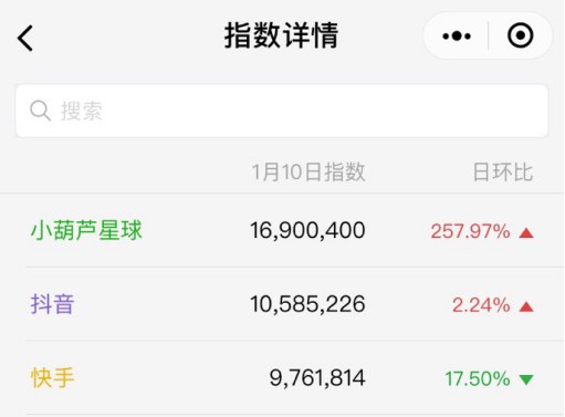 主播、粉丝、以及小葫芦星球,在三方的共同努力下,本次男神女神票选活动的话题热度蔓延至微信、微博、QQ等各大社交平台,成为直播圈的现象级活动。据微信官方数据显示,在活动最后一天,即1月10日这天,小葫芦星球的微信指数甚至超越了快手和抖音,高达1690万,日环比暴涨2.5倍。