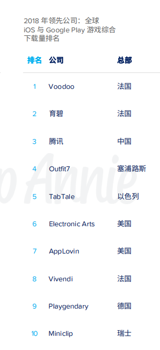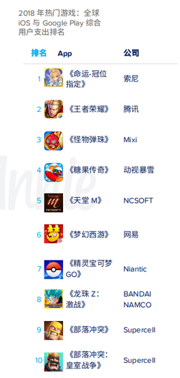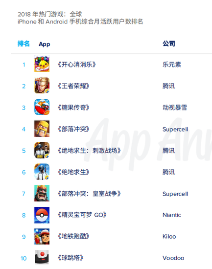 在2018年全球热门游戏iPhone和Android手机综合月活跃用户数前十的排名榜单中,中国公司乐元素《开心消消乐》位于榜首,腾讯的《王者荣耀》、《绝地求生:刺激战场》、《绝地求生》也在榜单分列2、5、6名。被腾讯以86亿美元收购的Supercell的《部落冲突》与《部落冲突:皇室战争》也位于榜单之上。值得一提的是,法国知名游戏厂商VOODOO研发的休闲益智类游戏《球跳塔》在2018年爆红,而其也出现在2018年全球热门游戏综合月活跃用户数排名中。