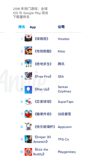 在2018年全球热门游戏iOS与Google Play综合下载量前十的排名榜单中,《球跳塔》位于榜首,腾讯的《绝地求生》获得第三名。并且,《球跳塔》开发商法国知名游戏厂商VOODOO也在2018年iOS与Google Play综合下载量厂商榜单中排名第一。而腾讯、网易则分列iOS与Google Play游戏综合用户支出排名一、二名。但2018年全球热门游戏iOS与Google Play综合用户支出排名第一的则是来自索尼的《命运—冠位指定》。