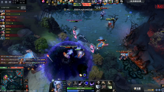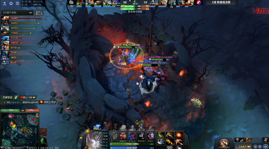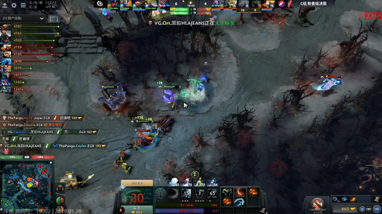 10分半VG中路抱团击杀电魂猛犸,此时人头比6:4,VG经济和人头数领先并不多,但Pango已经不怎么敢和VG打团了。16分钟,VG在肉山团击杀Pango多人,但己方英雄状态不好,被Pango趁机偷掉了肉山。