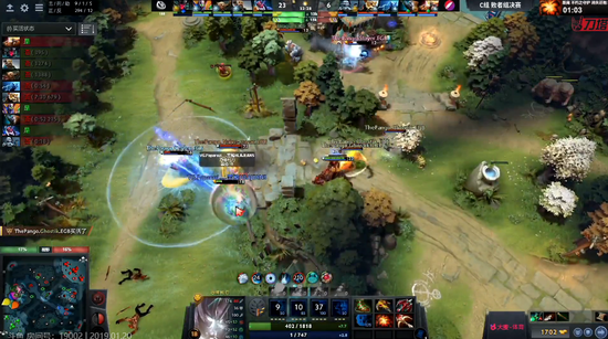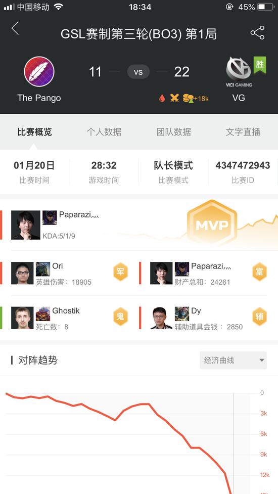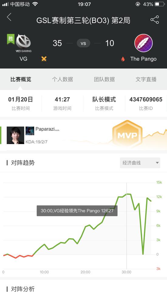 25分钟中路VG先手剑圣,不过剑圣成功开出BKB,配合猛犸用无敌斩打了很多输出,但只带走了一个萨尔,之后Pango就后继无力被VG击溃。
