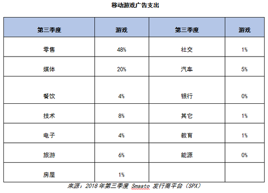根据Smaato近期调研显示,亚太地区大部分在移动游戏中投放广告的公司均来自零售业,这些公司占移动游戏应用整体广告支出的48%,其次是媒体公司占20%,科技公司占8%,和旅游公司占6%。