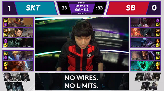 沙盒战队中下齐推,破掉SKT中下路高地。不过Faker成功大招斩杀德莱文,SKT获得喘息之机。