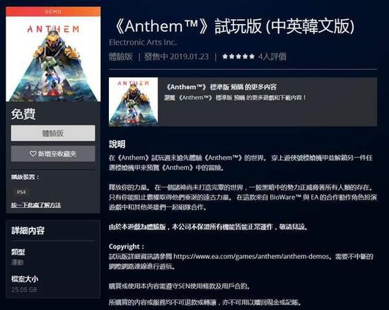 随着射击游戏《圣歌》发售日的临近,今天,Bioware分别在PSN港服商店和Xbox港服商店上架了该作的免费试玩Demo,据PS港服页面显示,试玩版支持中文,容量高达25.05GB。