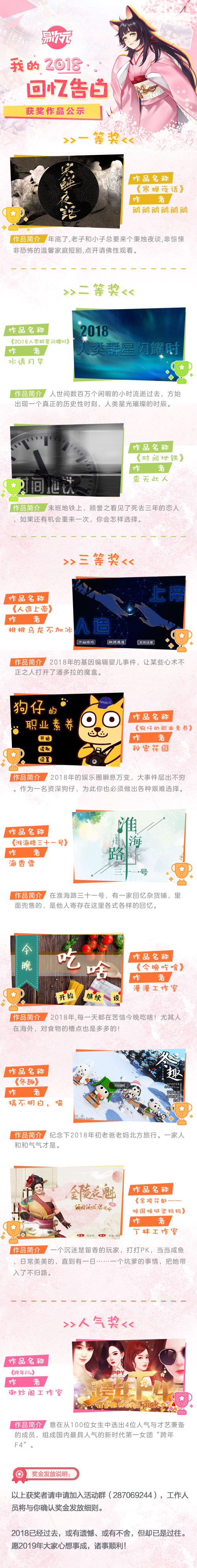 2018年12月31日,《易次元》2018回忆告白AVG大赛正式启动:用AVG的形式创造你所理解的2018年,投稿至《易次元》平台。本次大赛获奖作品一共10部,瓜分1万元的大神奖金!一等奖作品《寒蝉夜话》获得3000元奖金;二等奖两名,分别为《人类群星闪耀时》和《时间地铁》,每人获得2000元奖金;三等奖六名,分别为《人造上帝》、《狗仔的职业素养》、《淮海路三十一号》、《今晚吃啥》、《冬趣》和《金陵花魁——倾国倾城梁妈妈》,每人获得1000元奖金;人气奖一名《跨年F4》,获得1000元奖金。