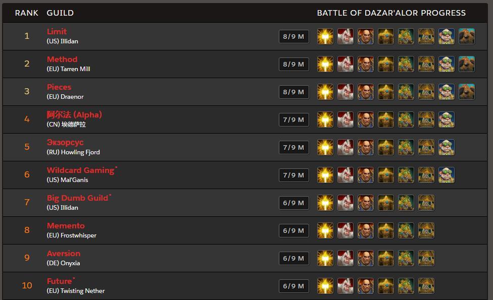 欧服Method公会和Pieces公会在一天内相继击杀8号BOSS风暴之墙阻击战,进度赶上了美服Limit公会。如果没有其他后来的搅局者,达萨罗的世界首杀应该会在这三个公会中决出!