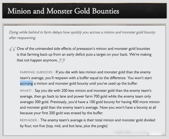 在新赏金机制中,赏金不仅可以从击杀人头数高的敌人获取,击杀发育补刀相对高的对手也可以获得相应的补刀数。也就是说你在游戏中一个人头都没拿只想安安稳稳发育,但是会发现自己莫名成了悬赏目标,因此这样的机制从新版赏金上线的第一天就被很多玩家吐槽,只不过拳头一直没有找到很好的解决办法。