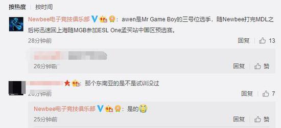 根据Newbee战队的转发和在微博评论区的回复,之前租借的东南亚选手JT-试训失败,战队三号位暂时由MGB战队选手awen担任。