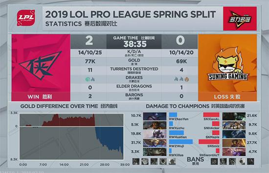 31分钟,RW依靠着三条水龙的强力回复能力强开大龙,苏宁前来阻拦,不料SMLZ的卡莎被布隆先手开到,在交出闪现后依旧被击杀。失去了卡莎的输出苏宁无力阻挡,RW带着第二条大龙BUFF从下路一鼓作气攻上对手高地,再度击杀苏宁4人后,SMLZ只能在泉水中看着自家基地被破。RW先声夺人1-0暂时领先。