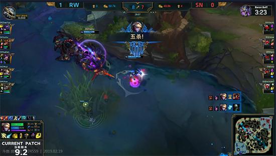 比赛的僵局终于在27分钟被打破,苏宁中路突袭将连续击杀RW贾克斯和塔姆,随后直接开大龙。然而RW在队员复活之后非常果断的选择与苏宁在大龙处开团,苏宁全员前后受敌,状态被消耗的非常差。RW下路AD EZ终于在此刻站了出来,他依靠精妙的走位和出色的操作,先后将苏宁团灭拿到5杀ACE!大龙也被RW打野皇子抢到。
