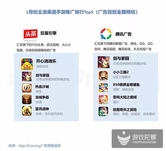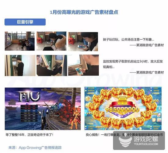 基于App Growing所追踪的广告数据,结合算法及机器学习原理,预估单条广告的1月份累计曝光情况,梳理1月份各主流渠道高曝光的游戏广告素材如下。