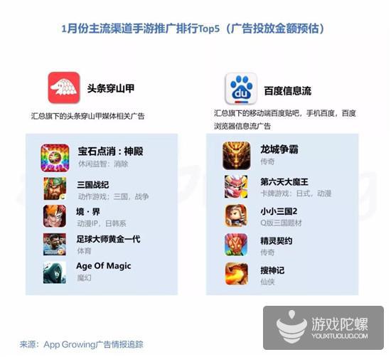 基于App Growing算法预估不同手游的投放金额,梳理出1月份手游推广排行榜Top20。传奇类手游《龙城争霸》占据排行榜榜首。而日系卡牌动漫游戏《第六天魔王》投放也较为抢眼。