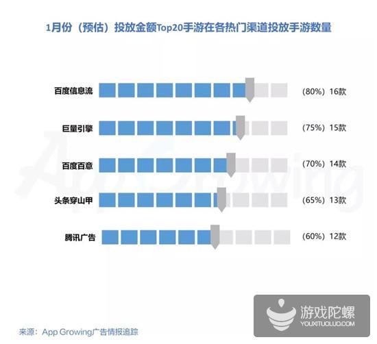 (↑ 点击查看大图查看更清晰)百度信息流渠道相对更受头部游戏买量主的青睐。Top20手游中,有80%的手游投放了百度信息流渠道。