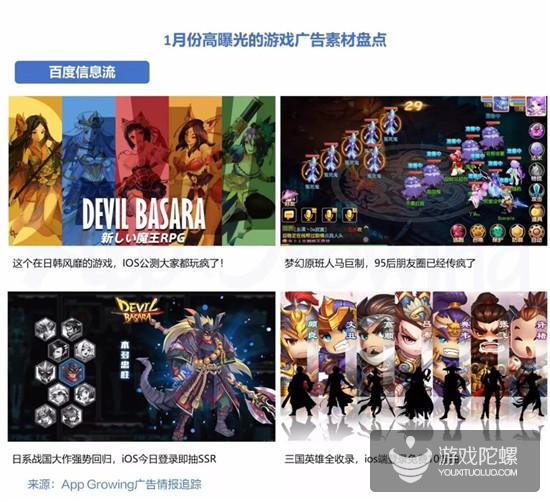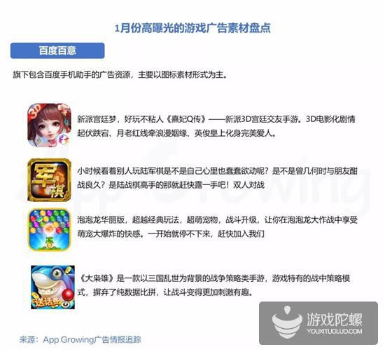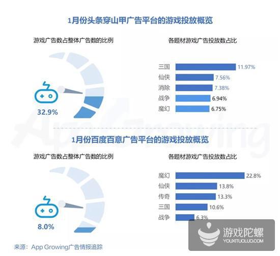 1月份,头条穿山甲广告平台游戏广告数占其整体广告数的32.9%,而三国,仙侠,消除题材的游戏投放较为热门。App Growing 所追踪到的百度百意平台的广告资源主要指百度手机助手的相关广告资源,主要以图标素材形式为主。