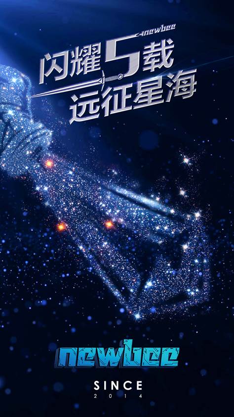 2019年2月24日,Newbee电子竞技俱乐部公布五周年庆典主题——“闪耀五载,远征星海”。短短八字,却如此的热情饱满、令人振奋,印证了Newbee电子竞技俱乐部这波澜壮阔的五年,也有着带领大家勇往直前的动力。