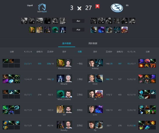 第一局Liquid为奇迹拿了常用的PA,并为马桶哥拿了老毒物毒龙。而EG这这边依然是CCNC惯用的中单大圣,但为RTZ拿了个非常少见的大哥滚滚。