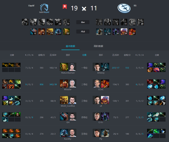 19分钟,Liquid集结推下,超级大劣势的EG居然还有人敢在塔后围观,在击杀了先知土猫后Liquid冲上高地,结束比赛。比分来到了2:0.