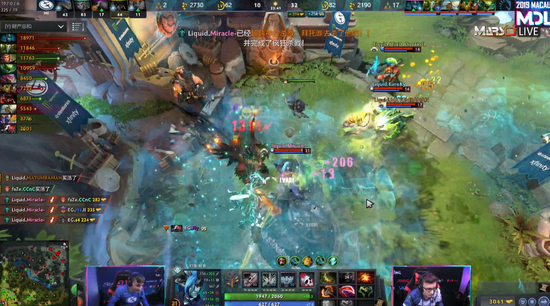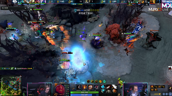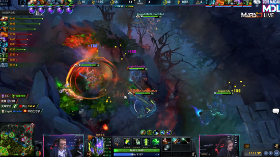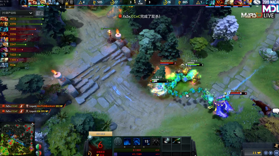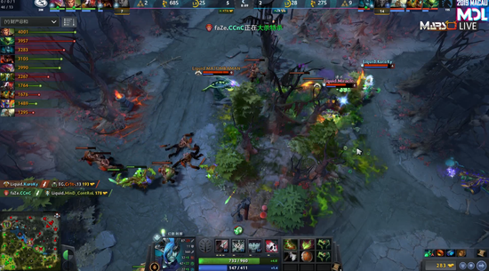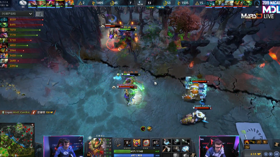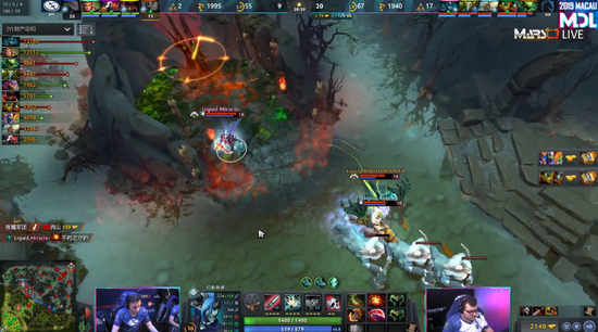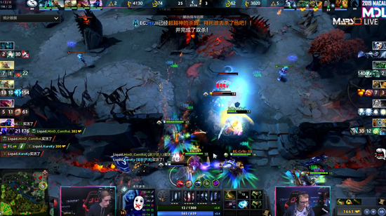 9分钟EG三人包中先杀德鲁伊再杀猛犸巫妖,打了一波很不错的节奏。11分钟EG人头数4:5落后,但是Liquid双大哥经济非常爆炸,远超火猫和PA,他们的情况并不乐观。