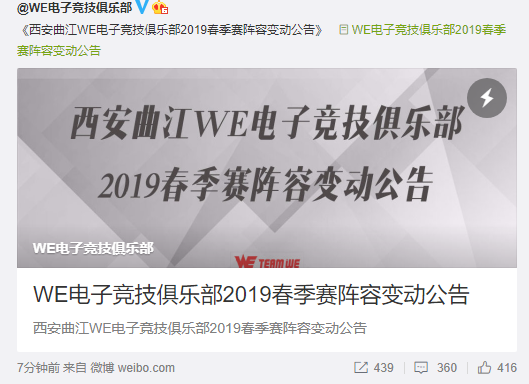 经过俱乐部与选手充分的沟通,双方达成了一致的决定。原WE电子竞技俱乐部英雄联盟分部打野选手胡志威(ID:WE.Pepper)将以转会形式,转出至V5电子竞技俱乐部。希望他在这个崭新LPL的团队中,能发挥所长,带领队伍取得优异的成绩。