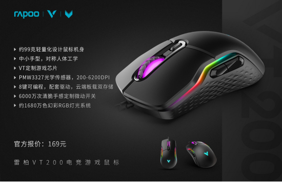 雷柏VT200已正式上市,拥有纯正的VT血统,轻量化的设计思路,强悍的硬件配备,贴心实用的功能,个性化的背光系统,再加上169元的官方报价,势必再掀起VT电竞风潮!