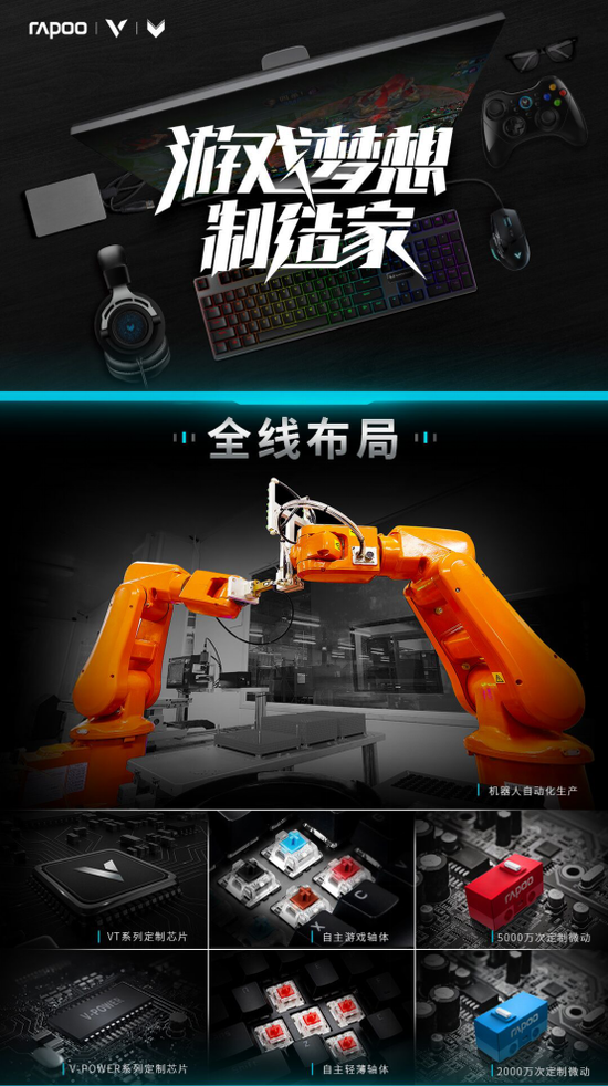 2008年,雷柏开始专注游戏外设领域,坚持机器人自动化,科学生产,品质管理,打造游戏鼠标、游戏机械键盘、游戏耳机、游戏手柄、游戏鼠标垫等全线游戏电竞外设产品。