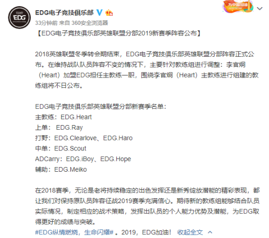 2018英雄联盟冬季转会期结束,EDG电子竞技俱乐部英雄联盟分部阵容正式公布。在维持战队队员阵容不变的情况下,主要针对教练组进行调整:李官炯(Heart)加盟EDG担任主教练一职,围绕李官炯(Heart)主教练进行组建的教练组将不日公布。
