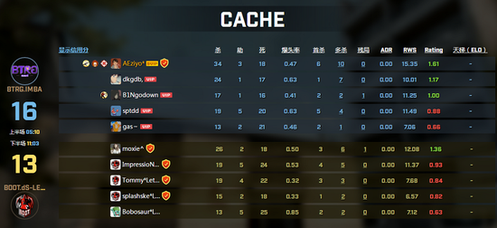 在图三Cache上,开局进攻方的BOOT赢下手枪局后想要再扩大优势,moxie和Impression在进攻中各完成一波4杀,上半场只有AE一个火力点的BTRG没能打出自己的风采,比分也定格在5:10,下半场攻防互换后,BTRG在AE频频首杀打开局面后,终于找到了自己的节奏,AE也频频刷屏,稳住了军心,最终BTRG成功翻盘16:13带走了对手,赢下了图三。也顺利取得了小组第二个出线的资格。