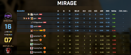 在今天败者组的比赛中,BTRG遇上了BOOT,在图一Mirage这张图上,开局赢下手枪局的BTRG频频前进,gas依然Carry着全局,拱门和VIP组成的交叉火力死死防住了BOOT的进攻,而BOOT只有两个火力点,上半场BTRG11:4取得大优势。下半场进攻方的BTRG由dkgdb频频首杀打开局面,而BOOT在3名队员没有状态的机会下被BTRG抓住机会,最终16:7赢下了图一。