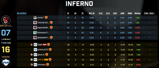 在inferno这张地图上,MVP在防守上防住了BOOT的进攻,虽然moxie在进攻中拿到了4杀,为队伍添上一分,但是手感早已打出的MVP在XigN的带领下上半场获得大优势,下半场的MVP5人发力,minixeta两次完成1V2的残局,使得MVP继续扩大优势,最终MVP16:7赢下了这场比赛,获得了小组第一个出线的资格。