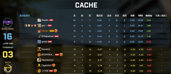 在图一Cache上,防守方的BTRG依然靠着gas打开局面,赢下手枪局后,开始疯狂拉大比分差距,gas和B1Ngodown在防守中的两次四杀使得BTRG上半场12:3获得大优势,下半场攻防互换后,赢下手枪局的BTRG一波4-0带走了对手,赢下了图一。