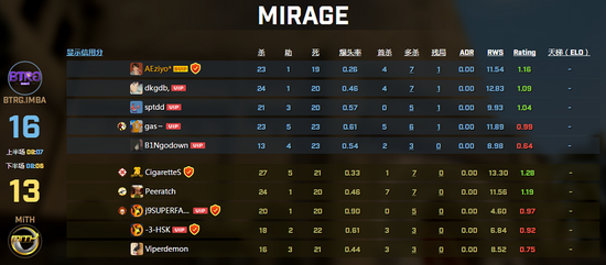 在图二Mirage上,双方互咬比分,长枪局打的你来我往,MiTh的Cigarettes在防守中拿下4杀,然而BTRG五名队友的发挥使得比分没有扩大,最终上半场比分定个在8:7,下半场的AE完成1V1的残局,而dkgdb也完成一波1V2的残局,状态起来的BTRG打破了Mith的进攻节奏,最终BTRG16:13赢下了图二,也最终2:0战胜了对手。